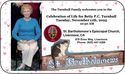The Turnbull Family will celebrate the life of Betty PC Turnbull (1927-2020) on Veterans Day, November 11, 2025, exactly 50 years after we celebrated Herb Turnbull's Life at St. Bartholomew's Episcopal Church, 678 Enos Way, Livermore, CA. Episcopal Priest Bill Doggett will lead the celebration, which will begin at 10:30 a.m. on Tuesday. All are welcome to join us for the Memorial. When Herb Turnbull joined Sandia Labs in 1958, Betty and their toddler son James (b. 1956) moved to Livermore, and Andrew was later born in 1961. In 1969, Betty became a teacher for the Livermore School District, where she taught for over 30 years, retiring in 2001 at the age of 75. The Turnbull family was active at St. Bartholomew's Church, Scouting Pack and Troop 900, Livermore Aquacowboys, and Livermore and Granada High. Betty became a widow when Herb passed in 1975. Betty enjoyed Country Line Dancing from her mid-60s through her 80s, and she appreciated the attention she received at Sunol Creek Memory Care in Pleasanton during her final four years, passing away peacefully with her two sons present in May 2020. Indeed, it has been a long time since both Herb Turnbull and Betty Turnbu...